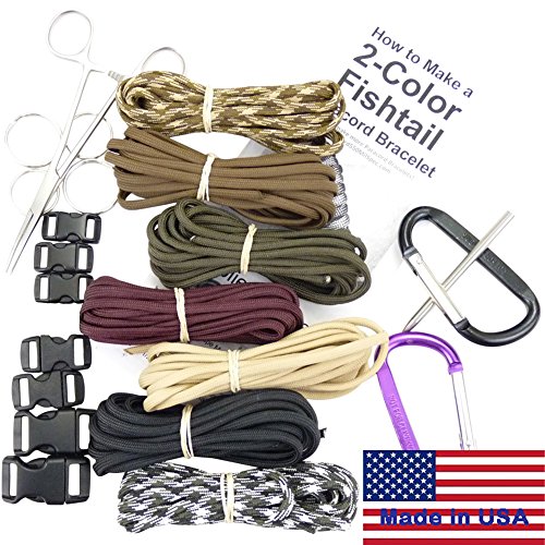 Guys Starter Kit - 550 Paracord, Buckles, Carabiners, Key Rings, Bracelet Finishing Tools, Written Instructions & eBook. Made in U.S.A. 7 Colors Paracord = 70 Ft.